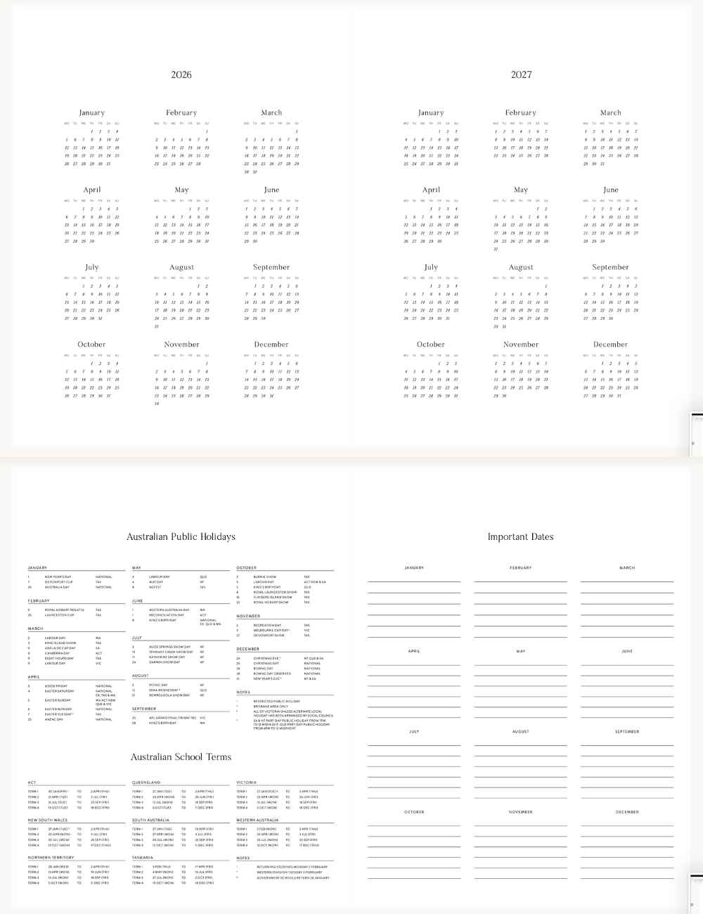 ●日本の祝日は記載されておりません。オーストラリアの祝日・行事が表記されています。