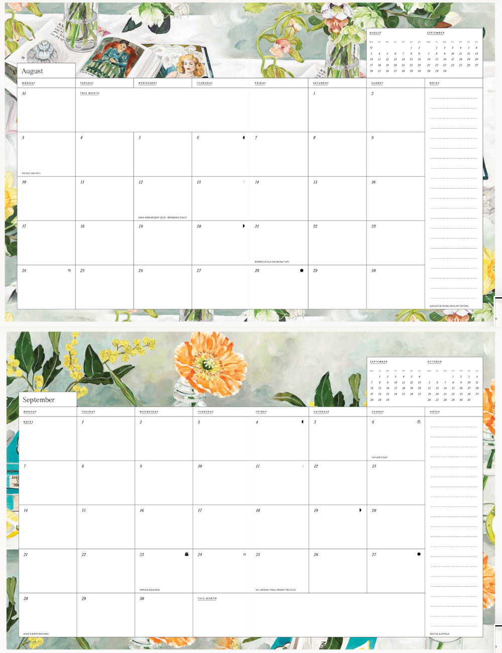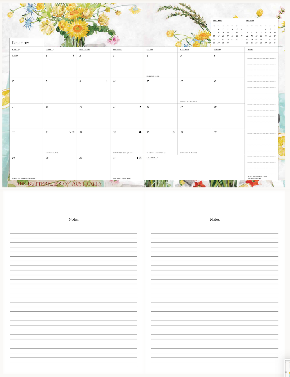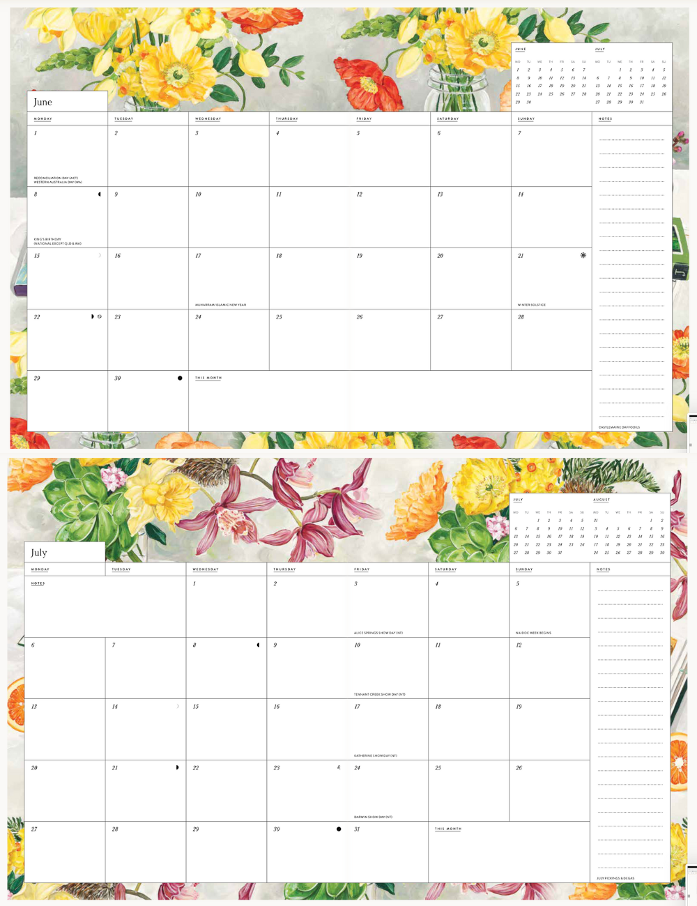(オーストラリアの祝日、主要イベント(バレンタイン・母の日など)、月の満ち欠け、星座情報、夏至などの表記あり。※ 日本の祝日は記載がございません。)