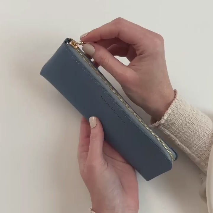 ヴィーガンレザー素材のスリムなペンケース | おしゃれでシンプルなデザイン | ブルー色のペンポーチ | お仕事やお出かけ用におすすめ
